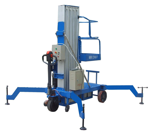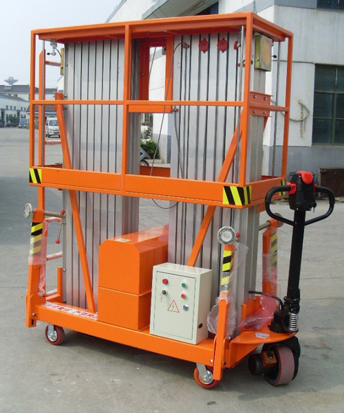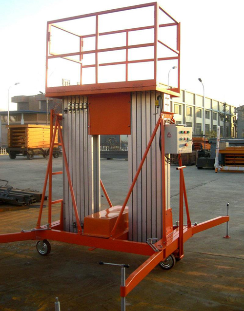 鋁合金液壓升降機整機重量輕,機動性好,適合單人操作;特制的桅柱間導輪裝置,升降平穩自如;結構緊湊,運輸狀態尺寸小,可進入一般電梯的轎廂以及能順利通過門洞和狹小通道;雙重保護的支腿結構,工作更安全,且可貼近工作面升降作業;根據使用場所高的要求,可做成手動放到或電動放到式升降平臺。以滿足門口比較低時使鋁合金升降平臺無法進入的情況。